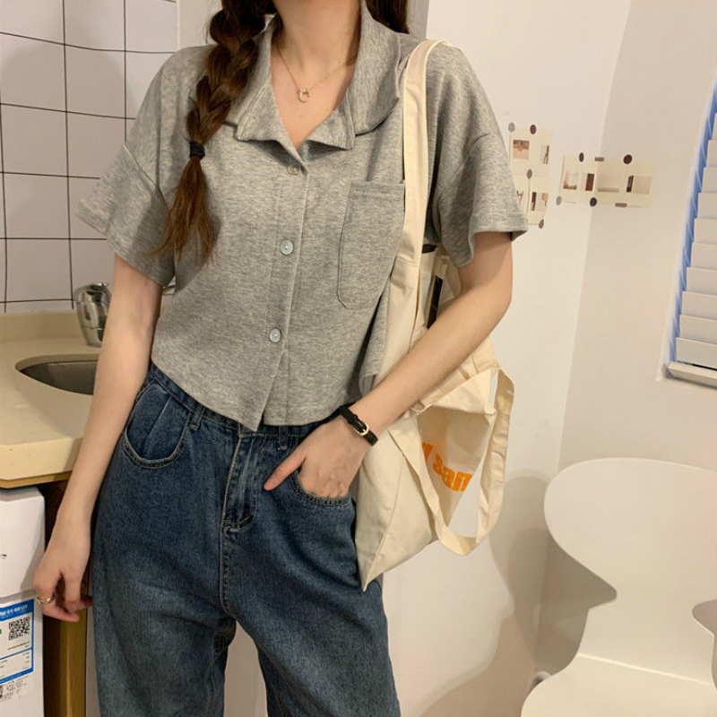 Shirts Women Pocket Solid Short Sleeve Casual Sweet Simple Summer Crop Tops Womens s Style Designed Chic Streetwear Trendy