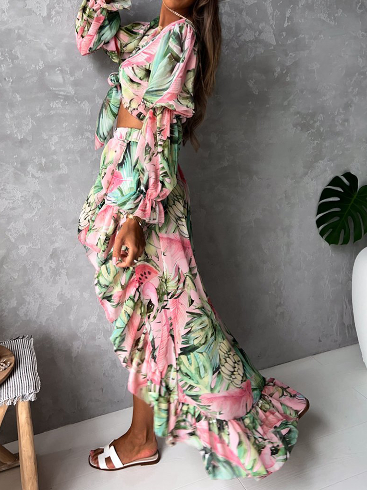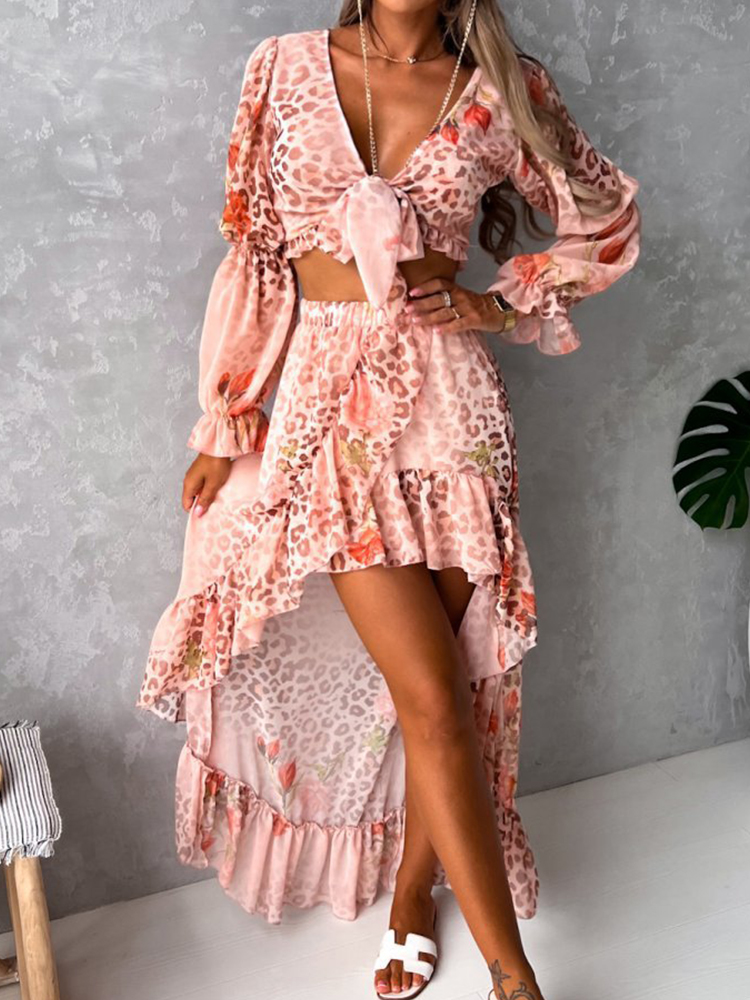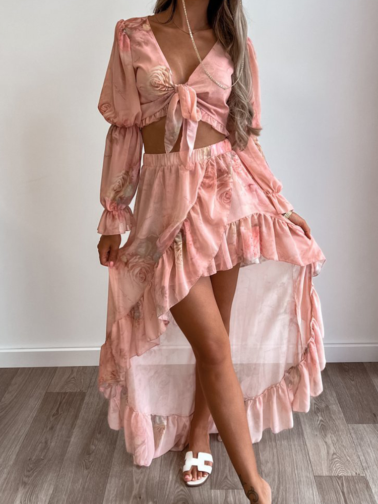 Slim Lady Beach 2 Piece Sets Summer Women Sexy Long Sleeve V-Neck Lace-up Hollow Short Top + Irregular Ruffle Skirt Suit