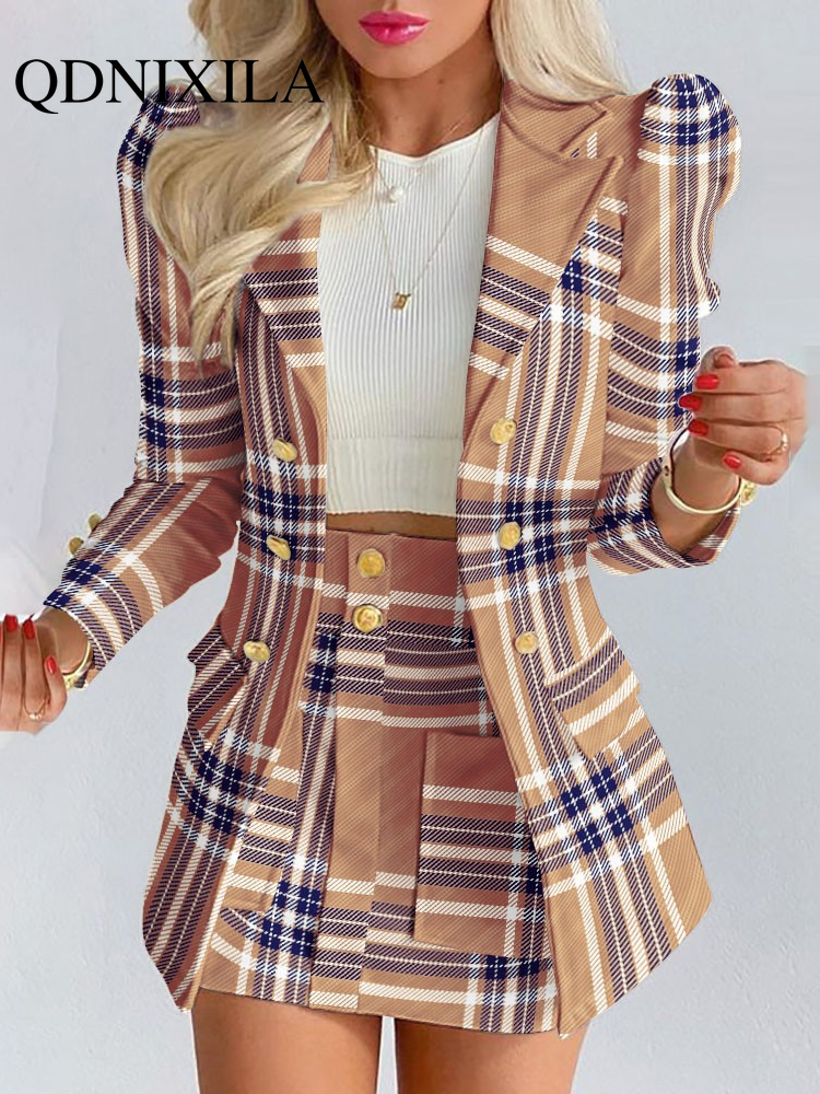 Spring and Autumn Leisure Suit Women's Double-breasted Long Sleeve Skirt Suit 2-piece Office Women Dress Skirt Set