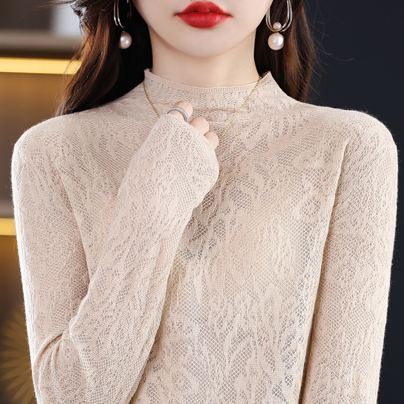 Spring and Autumn Three-dimensional Carved Half Turtleneck Lace Hollow Knitted Sweater Women's Pullover Sweater