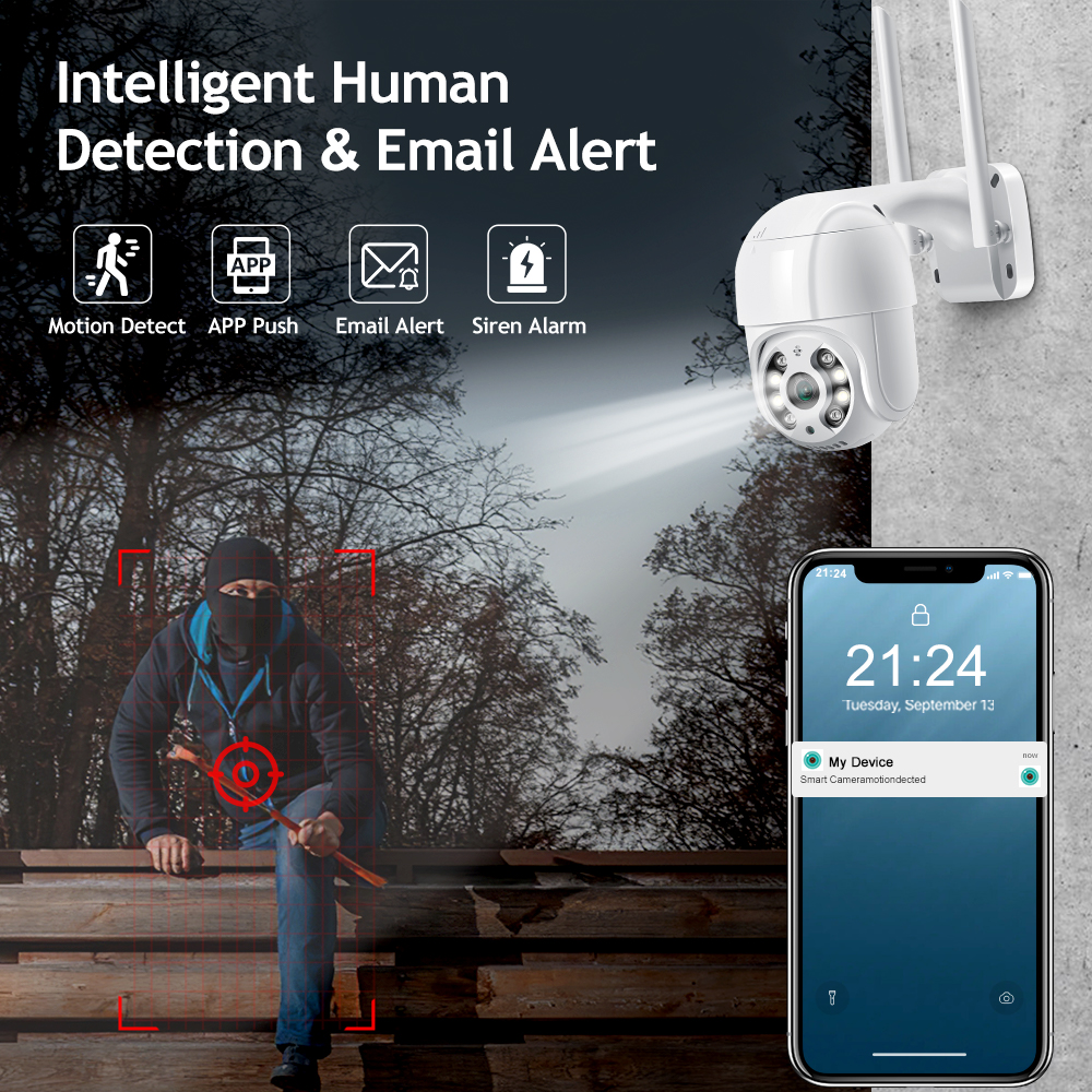 When someone breaks into shooting area, the camera will emits a sound to scare off intruders (customizable alarm sound). And it will push the alarm message to your mobile APP, then 4 white LED lights illuminate the intruder.