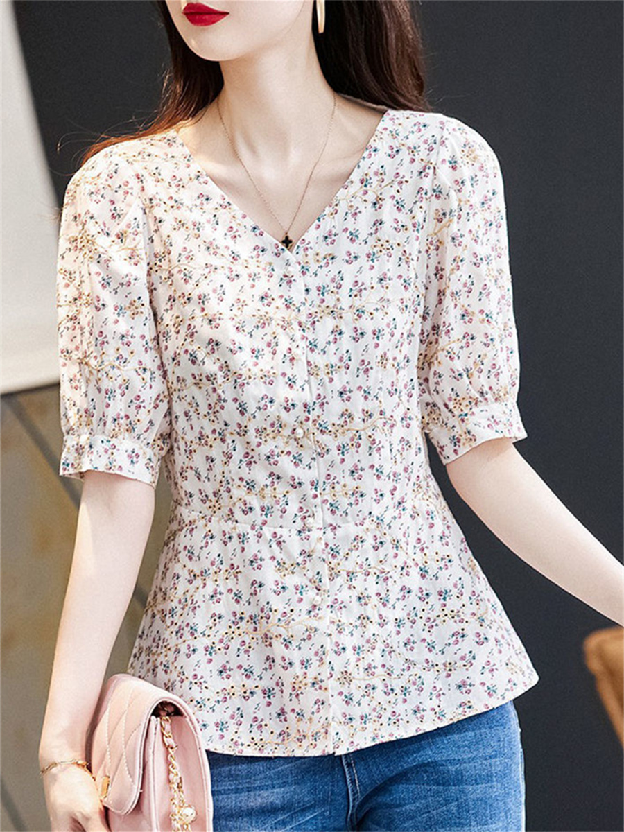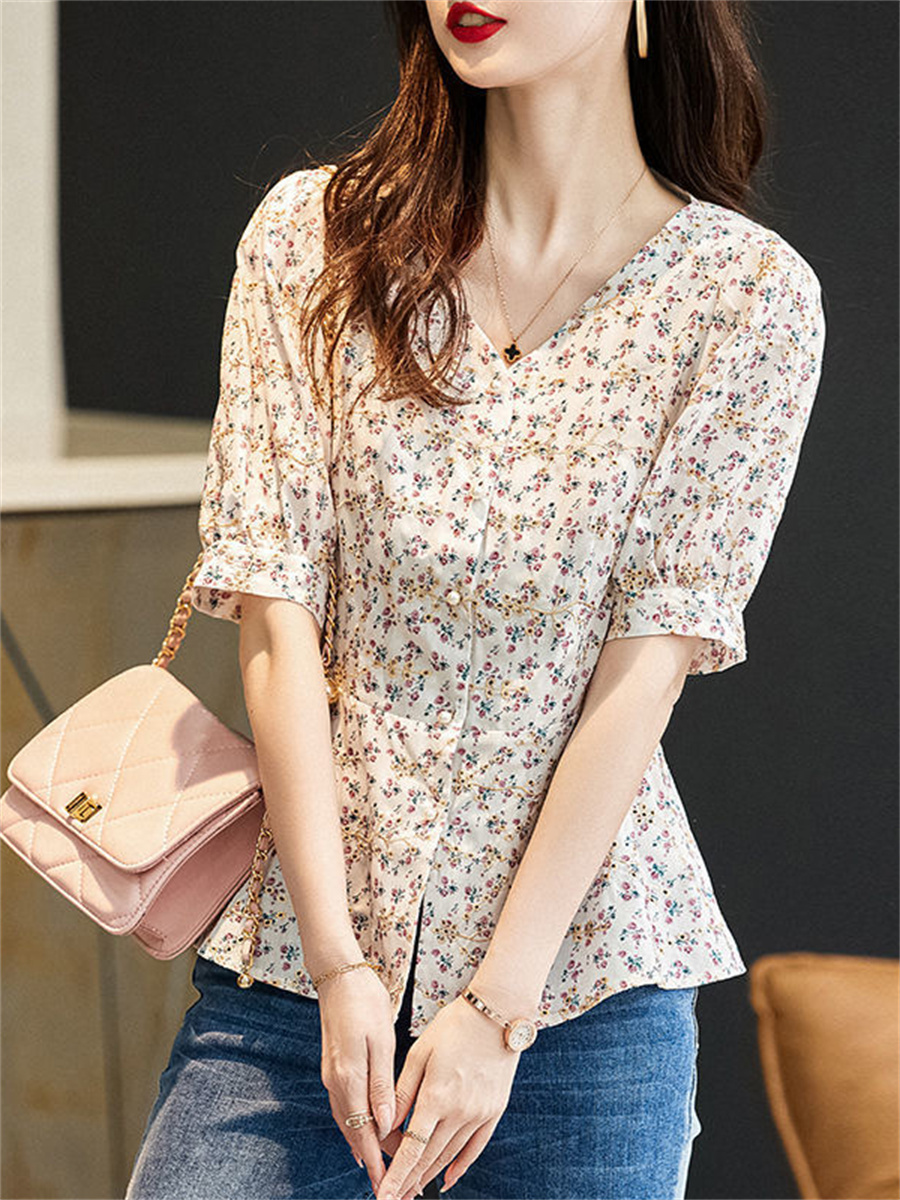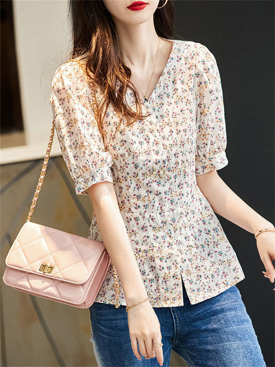 Woman Summer Style Chiffon Blouses Tops Lady Casual V-Neck Short Sleeve Flower Printed Blusas Tops DF4473