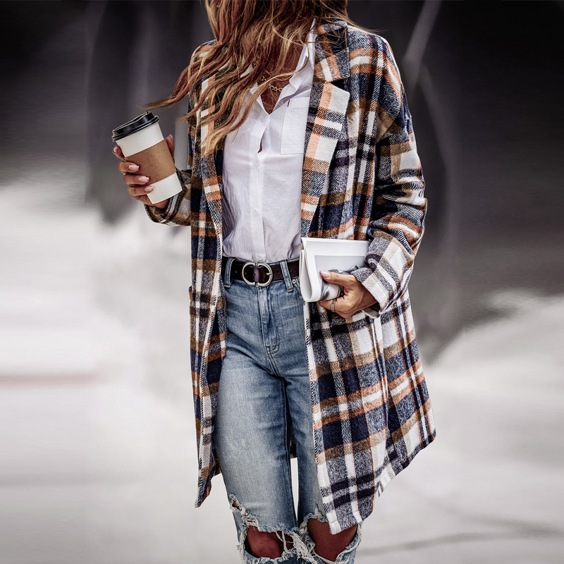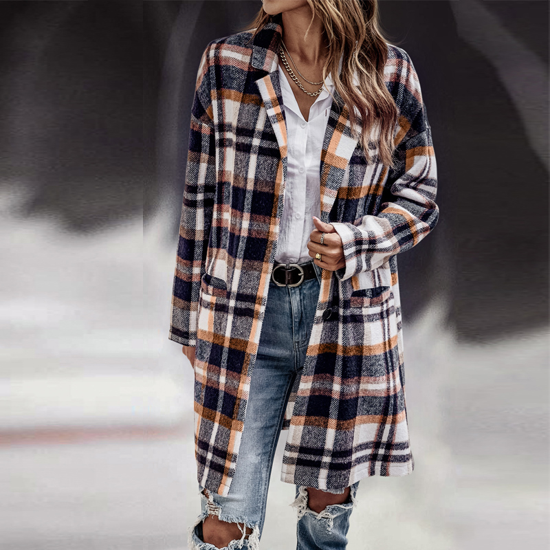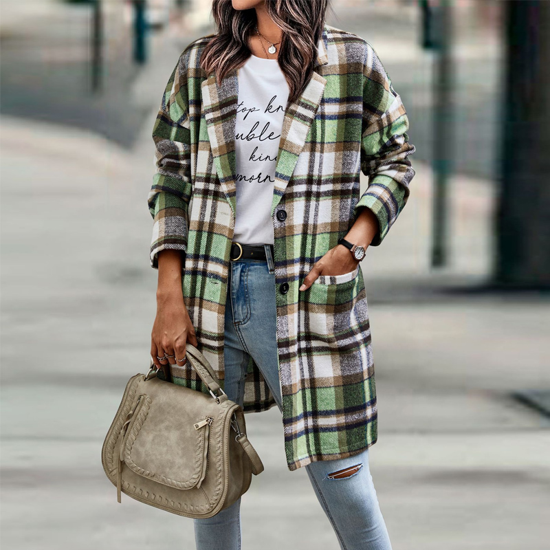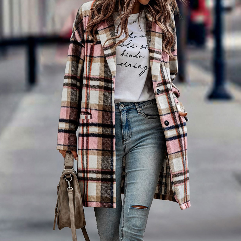Women Autumn Winter Pocket Plaid Warm Coats Casual Street Loose Long Sleeve Button Jackets Vintage Loose Cardigan Lapel Overcoat