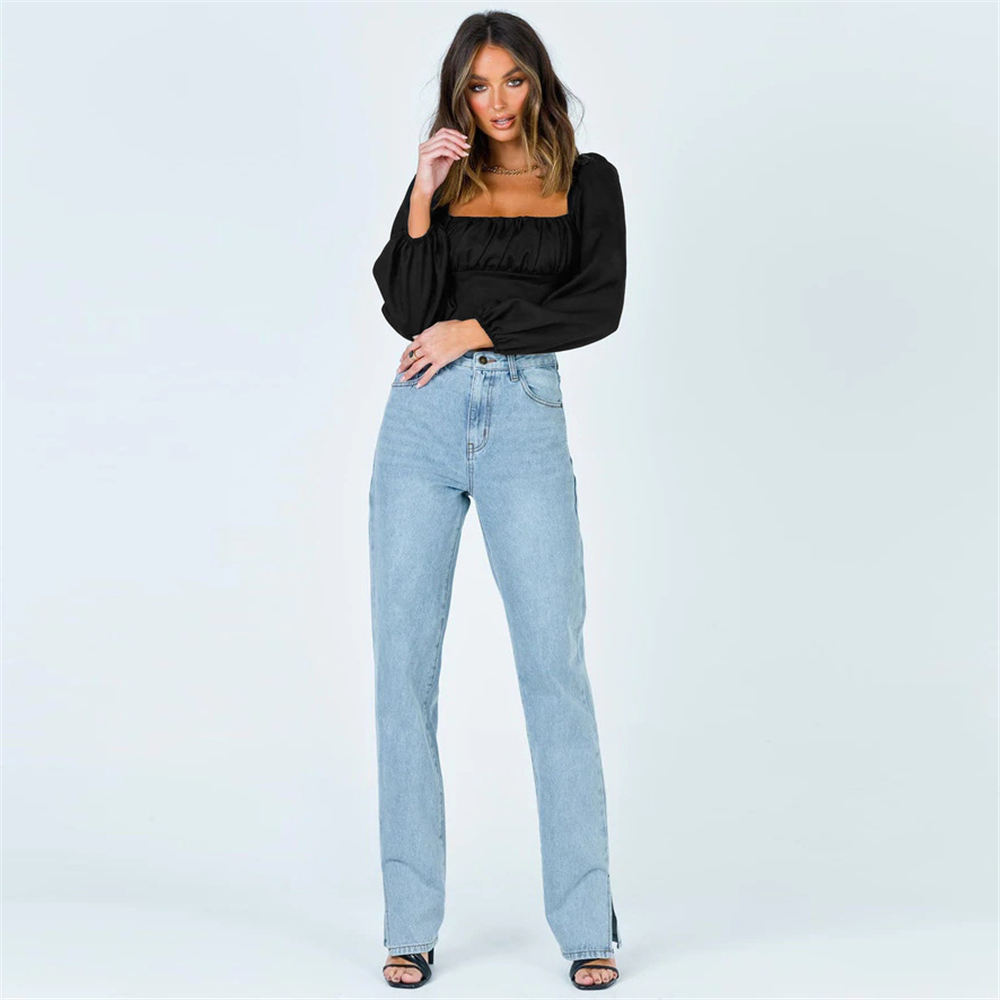 Women Slash Neck Blouse Ladies Girls Long Puff Sleeve Folds Waist Backless Short Shirt Female Crop Clothes