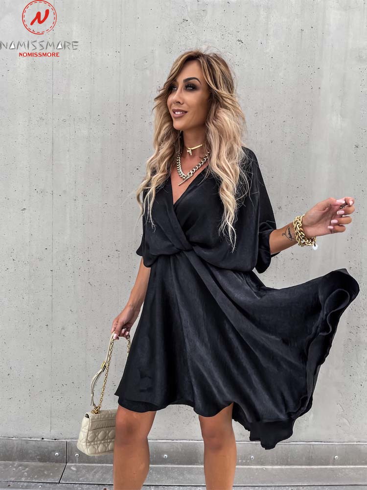 Women Summer Solid Color A-Line Dress Irregular Design V-Neck Half Sleeve Mid Waist Casual Loose Mini Dress