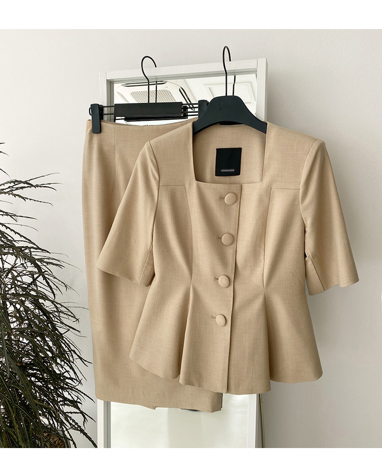 Women's Office Suit Short Sleeve Slim Belt Take Waist Blazer Top + Mid Pencil Skirts Suits 2 Piece Set