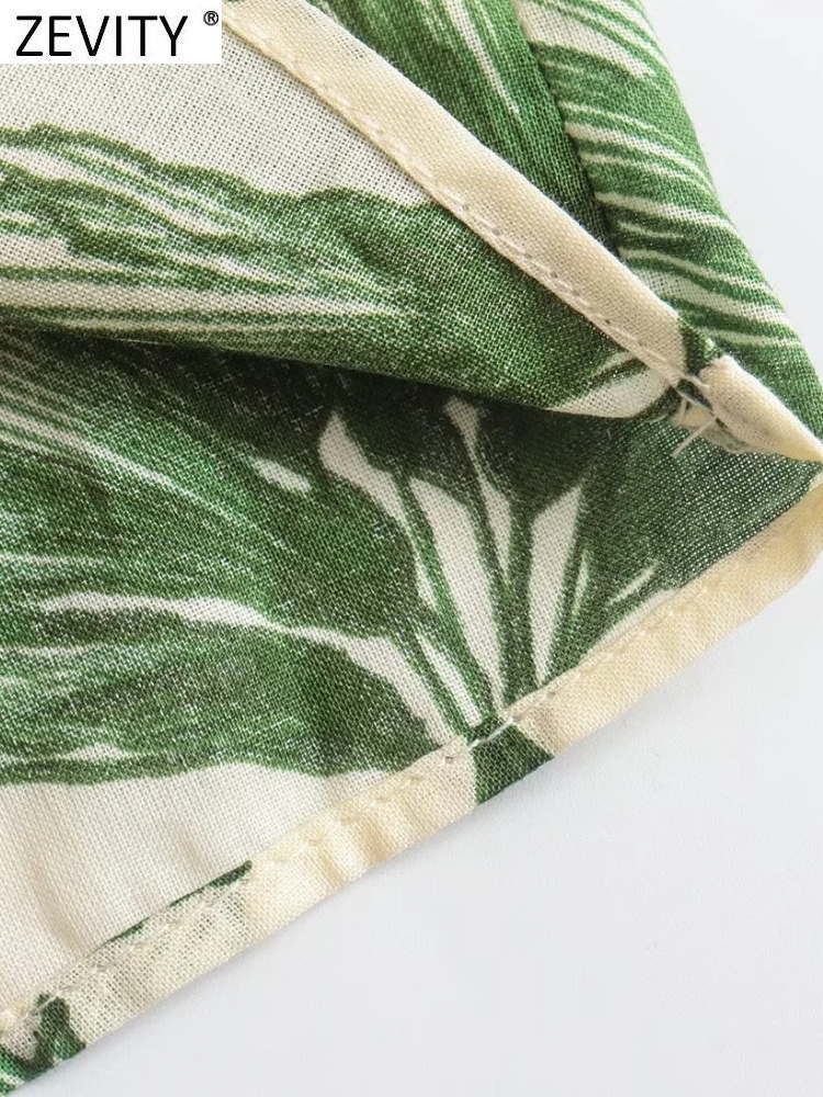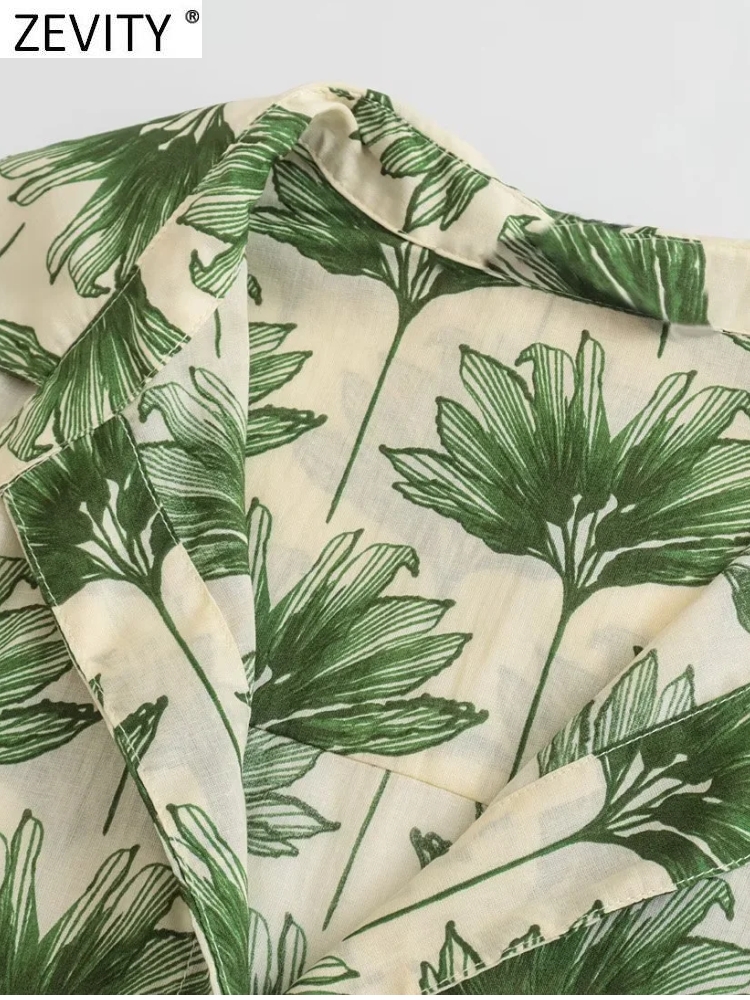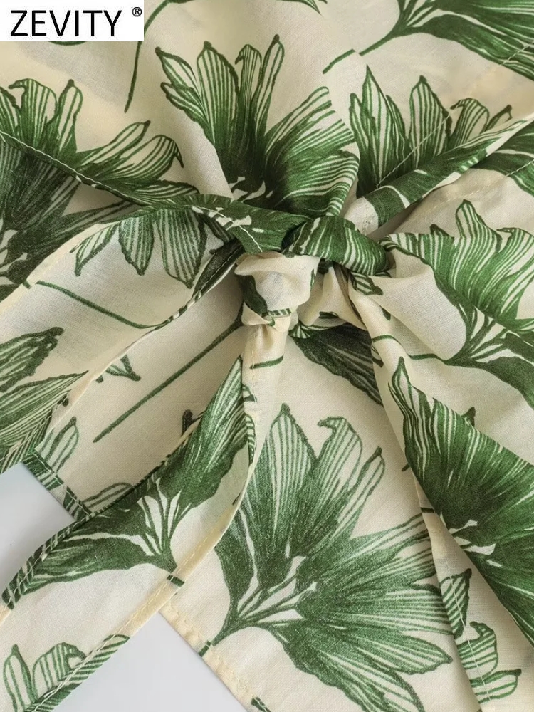 Zevity Women Vintage Green Leaves Floral Print Hem Knotted Smock Blouse Female Breasted Shirt Chic Chemise Blusas Tops LS2016