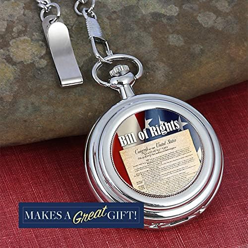 The Silver Tone Half Dollar Coin Pocket Watch is the classic time piece. A simple but sleek silver tone case houses a genuine United States half dollar colorized with the Bill of Rights. The JFK Half Dollar first minted in 1964 was intended as a memorial to the assassination of President John F. Kennedy. It is still minted today but rarely seen as they have not been released into circulation for over 10 years. The Bill of Rights spells out Americans’ rights in relation to their government. The coin is secure in the pocket watch casing and opens to quartz style and second sweeping hand over classic Roman numerals. The pocket watch is 1 7/8 inches in diameter and hangs from a 14 inch steel fob open link chain. This historical high polished time piece displays the beauty of a genuine US coin on the front and then brushed finish on the back, which may be engraved and personalized. Comes with a Certificate of Authenticity.