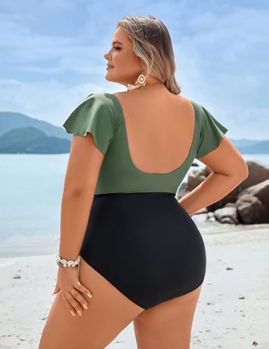 • Plus size swimsuit for women feature deep v neck, front crisscross, ruched details at the waist, ruffle sleeve and backless design.
