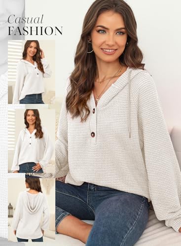 Dokotoo Hoodies for Women Waffle Knit Long Sleeve Drawstring Button V Neck Casual Pullover Sweatshirt Hooded Tops