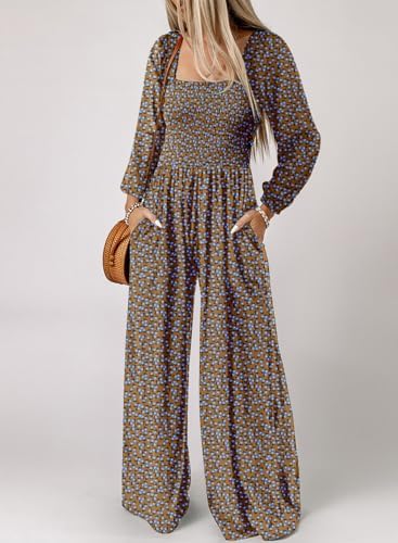 Dokotoo Women's Casual Loose Overalls Jumpsuits One Piece Long Sleeve Printed Wide Leg Long Pant Rompers With Pockets