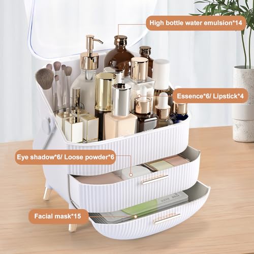 Makeup Organizer for Vanity, Make up Organizers and Storage, Cosmetics Skincare Organizers with Lid and Drawers, Cosmetic Display Cases for Countertop, Bathroom, Dresser, Ideal Gifts for Women(White)