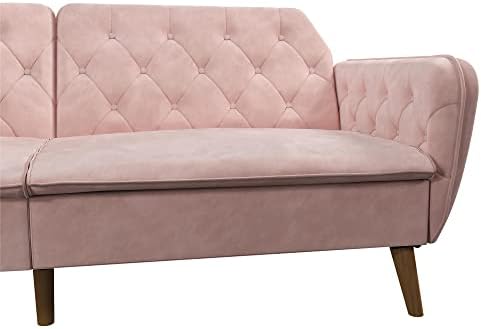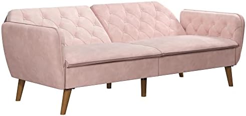 The Novogratz Tallulah Memory Foam Futon is exactly what you need and more! Bringing elegance and sophistication into your home with its vintage silhouette, rounded lines and button-tufted details. Designed with a soft velvet upholstery, this piece of furniture is both compact and multi-functional. Made with a sturdy wood frame, the Tallulah Memory Foam Futon is designed to offer nothing but superior comfort! The seat cushions are filled with high-density foam and responsive memory foam that will cradle your body to help relieve pressure points while you are watching TV or taking a much needed afternoon nap. The backrest features a split-back design that can be independently reclined to convert between multiple positions: sitting, lounging and sleeping. In other words, this means that you will now have an extra bed for overnight guests! Available in multiple colors, the Novogratz Tallulah Memory Foam Futon is finished with slanted wooden legs to add a last touch of chic style!