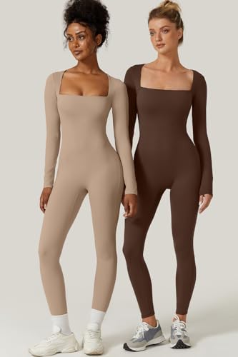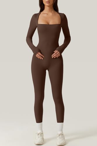 QINSEN Womens Sexy Square Neck Long Sleeve Full Length Leggings Bodycon Stretch Jumpsuit