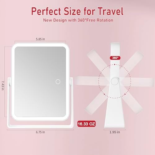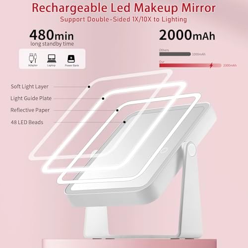 Rechargeable Travel Makeup Vanity Mirror with Lights and Magnification, Portable 10X/1X Magnifying Mirror with 3 Color Light, Lighted Makeup Mirror with Magnification, Desk LED Mirror, 360° Rotation