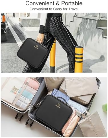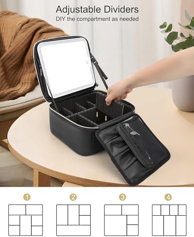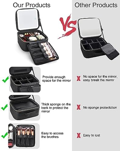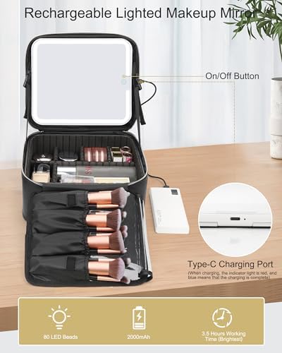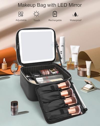 Relavel Makeup Bag with Light Up Mirror, Makeup Case Travel Cosmetic Bags Brush Organizer Storage Box, Rechargeable Vanity Mirror with 3 Color Lights, High Frame Mirror Protection (Black)
