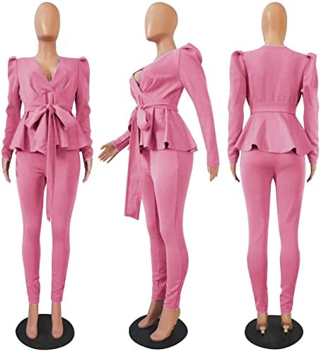 Remelon 2 Piece Outfits for Women Blazer with Pants Deep V Long Sleeve Slim Fit Ruffle Pelplum Business Suit