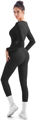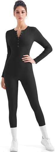 SUUKSESS Women Long Sleeve Ribbed Workout Jumpsuit One Piece V Neck Button Down Yoga Jumpsuits