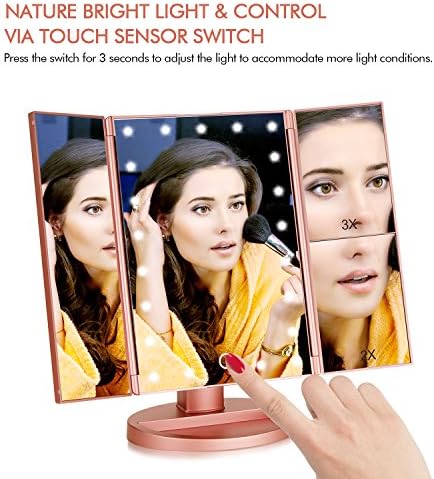 Tri-fold Lighted Vanity Makeup Mirror with 3x/2x Magnification,21 LEDs Light and Touch Screen,180 Degree Free Rotation Countertop Cosmetic Mirror,Travel (Rose Gold)
