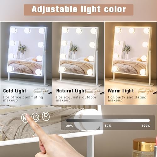 Vanity Mirror with Lights Hollywood Lighted Makeup Mirror with 9 Dimmable Bulbs & 3 Color Lighting Modes, Detachable 10X Magnification Mirror and 360 Degree Rotation(White)