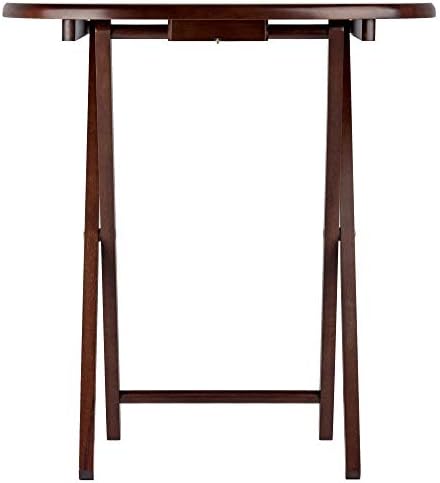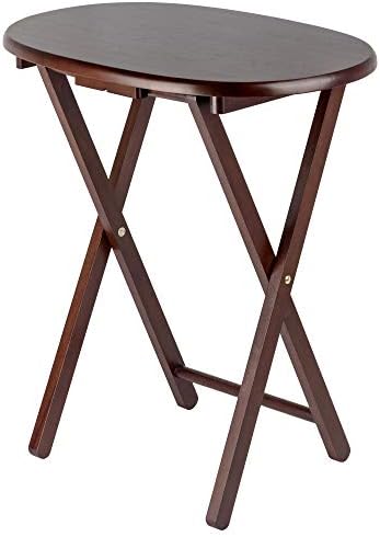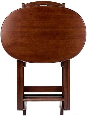 Make entertaining simple and easy with the Winsome Wood Nathan 5-Piece Snack Table Set. This versatile set includes four tables and for convenience a storage rack to store your tables out of the way when not in use. The oval shape of these snack tables makes these distinctive and stylish. Ideal for setting out appetizers at a party, enjoying a meal while relaxing on the sofa, or for working on your laptop. This set of foldable tables open up to X-frame bases which make these table not only look good but also help with stability. Tables easily open up, with a wood stopper on the other end helping the legs stay standing. Great for daily use and compact enough to store in the closet. Constructed of solid wood, the rich cappuccino finish brings out the warmth of the wood grain. Conveniently packed and shipped in 1 box. Tables arrive ready to use and require no assembly. Minimal assembly is required for stand. Replacement part request can be submitted directly to the manufacturer within 60 days from date of purchase. Individual Table Size: 20.7"W x 15.8"D x 25.5"H (open) Individual Table Size (closed): 20.7"W x 2"D x 29"H Dimensions of Stand with tables stored: 23.7"W x 12.9"D x 31.3"H Static Maximum Weight per Table: 25 lbs. Tables come fully assembled Storage Stand requires assembly Ships in 1 box