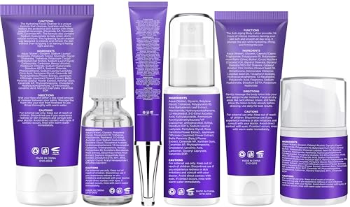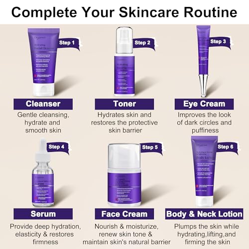 - Our skincare routine kit provides everything needed for younger-looking skin, including a facial cleanser, toner, eye cream, serum,face cream and body & neck lotion. The cleanser and toner gently cleanse and hydrate while restoring the skin barrier. The face cream, serum, eye cream, and neck lotion work together to hydrate,moisturize,anti-aging,firm,tighten,improving elasticity and enhance skin tone. Infused with premium ingredients like retinol, sodium hyaluronate, vitamin E, and glycerin, the products are cruelty-free and sulfate-free, suitable for all skin types, including sensitive skin