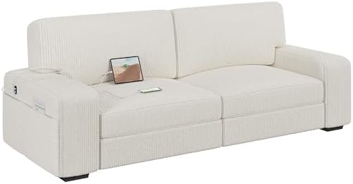 Yaheetech 83.5" W Modern Sofa Couch 2 Seater Corduroy Fabric Sofa with USB Charging Ports & Side Storage Pockets for Living Room Apartment, Ivory