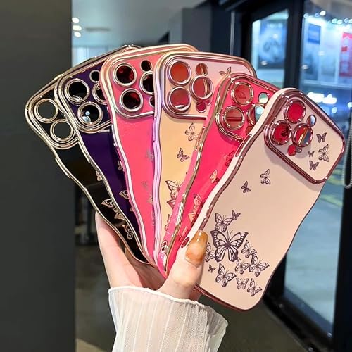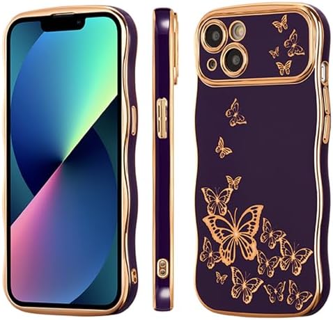ZTOFERA for iPhone 14 Case for Girl Women, Cute Curly Wave Frame with Luxury Plating Butterfly Pattern, Soft TPU Gold Edge Shockproof Raised Lens Protection Phone Case for iPhone 14, Dark Purple